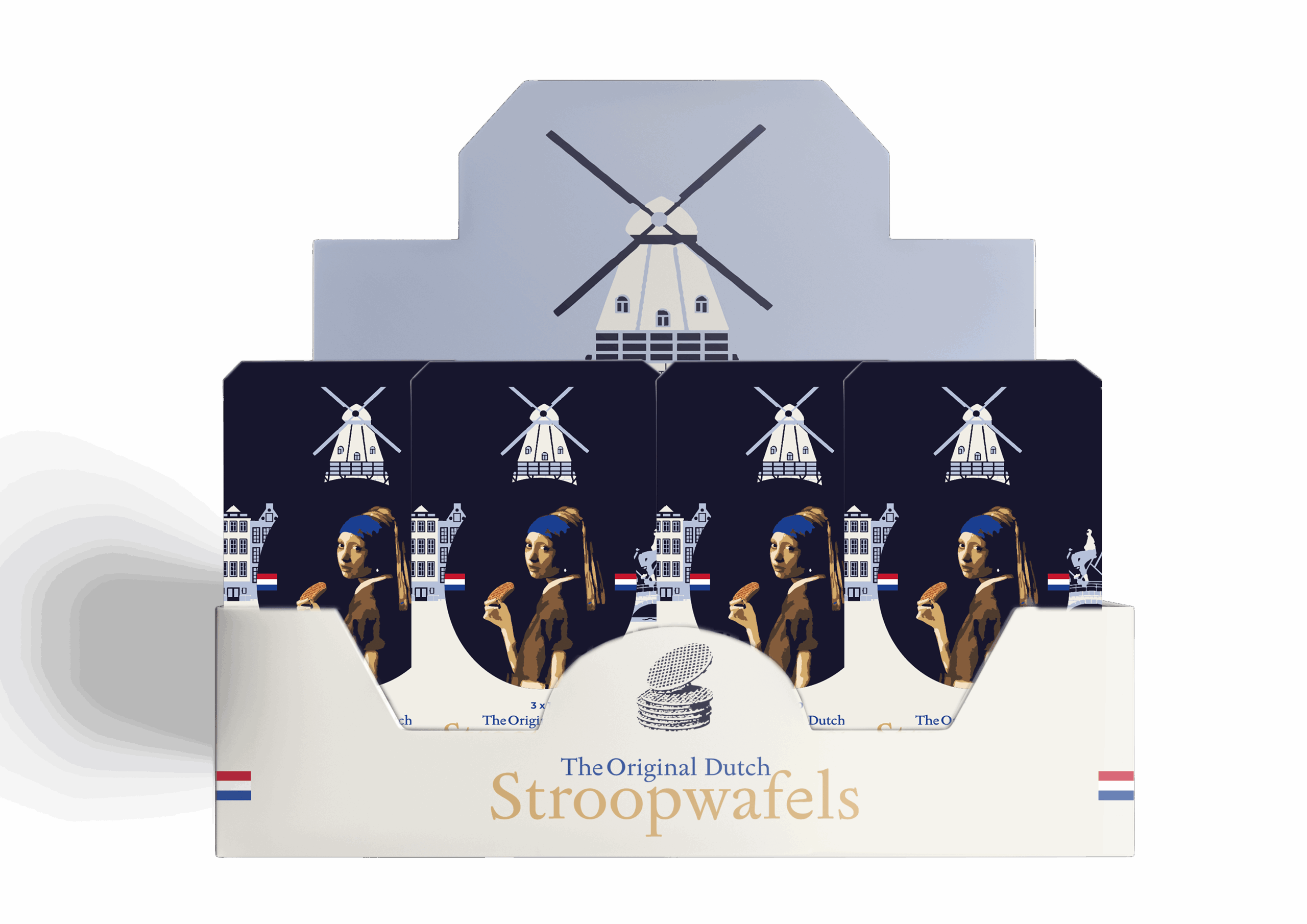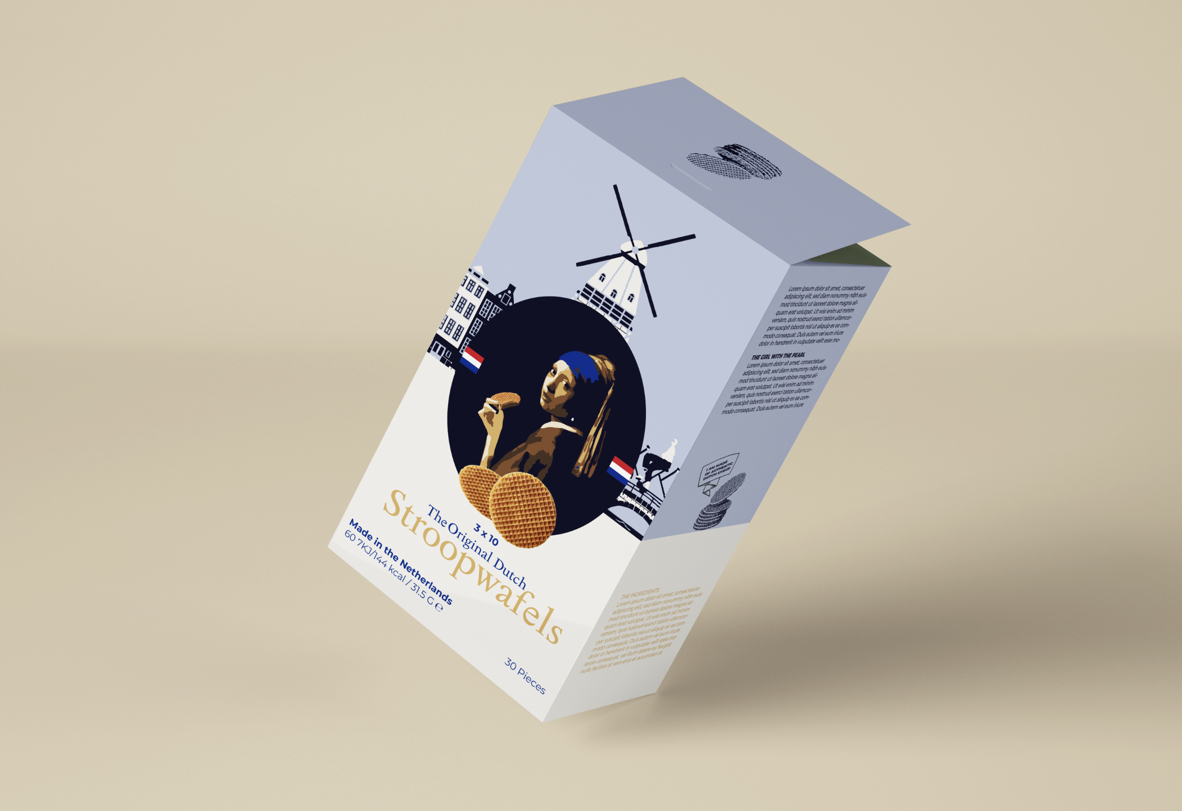 One highlight: reimagining the iconic Dutch stroopwafel for the U.S. market. The concept? “A golden oldie, redefined.” Inspired by Girl with a Pearl Earring and the visual richness of Dutch Golden Age art, we created a packaging identity that pays homage to tradition while embracing modern, minimalist sophistication.